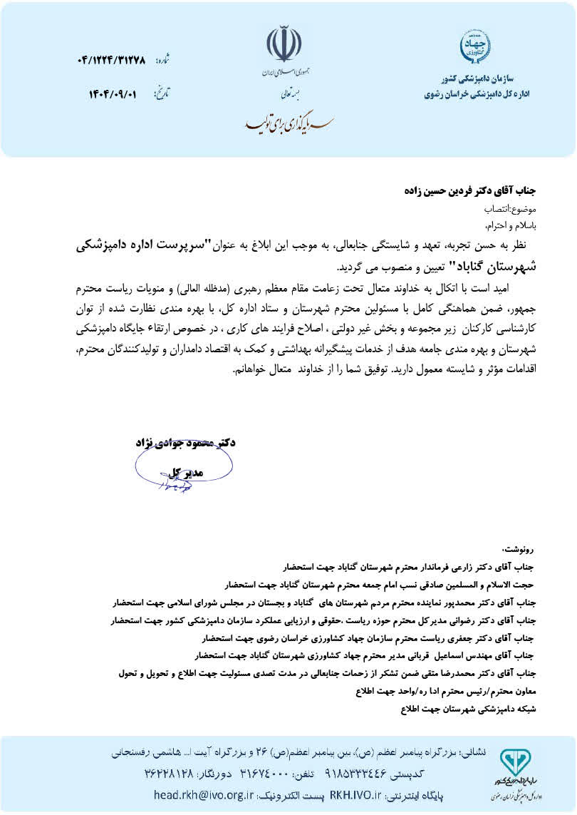 به گزارش فاخته، در این جلسه که با حضور دکتر شمس آبادی معاون توسعه و مدیریت منابع اداره کل دامپزشکی استان و حجت الاسلام شورورزی مسئول دفتر نمایندگی ولی فقیه اداره کل دامپزشکی استان برگزار گردید، طی حکمی از سوی مدیر کل دامپزشکی خراسان رضوی، دکتر فردین حسین زاده به عنوان سرپرست شبکه دامپزشکی گناباد منصوب گردید.