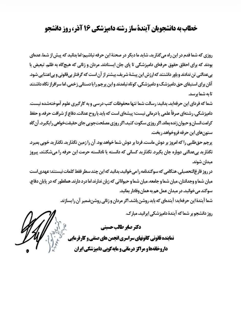 شماکه فردای این حرفه اید،بدانید: رسالت شما تنها محفوظات کتب درسی و به کارگیریعلوم آموخته شده نیست! دامپزشکی،رشته ای صرفاً علمی یا درمانی نیست؛ پیشه ای است که باید با روح عدالت، دفاع از شرافت حرفه، و حفظ کرامت انسان و حیوان زنده بماند. اگر روزی سکوت کنید، اگر روزی مصلحت جویی جای حقیقت خواهی را بگیرد،آنگاه ستونهای این حرفه فروخواهد ریخت.