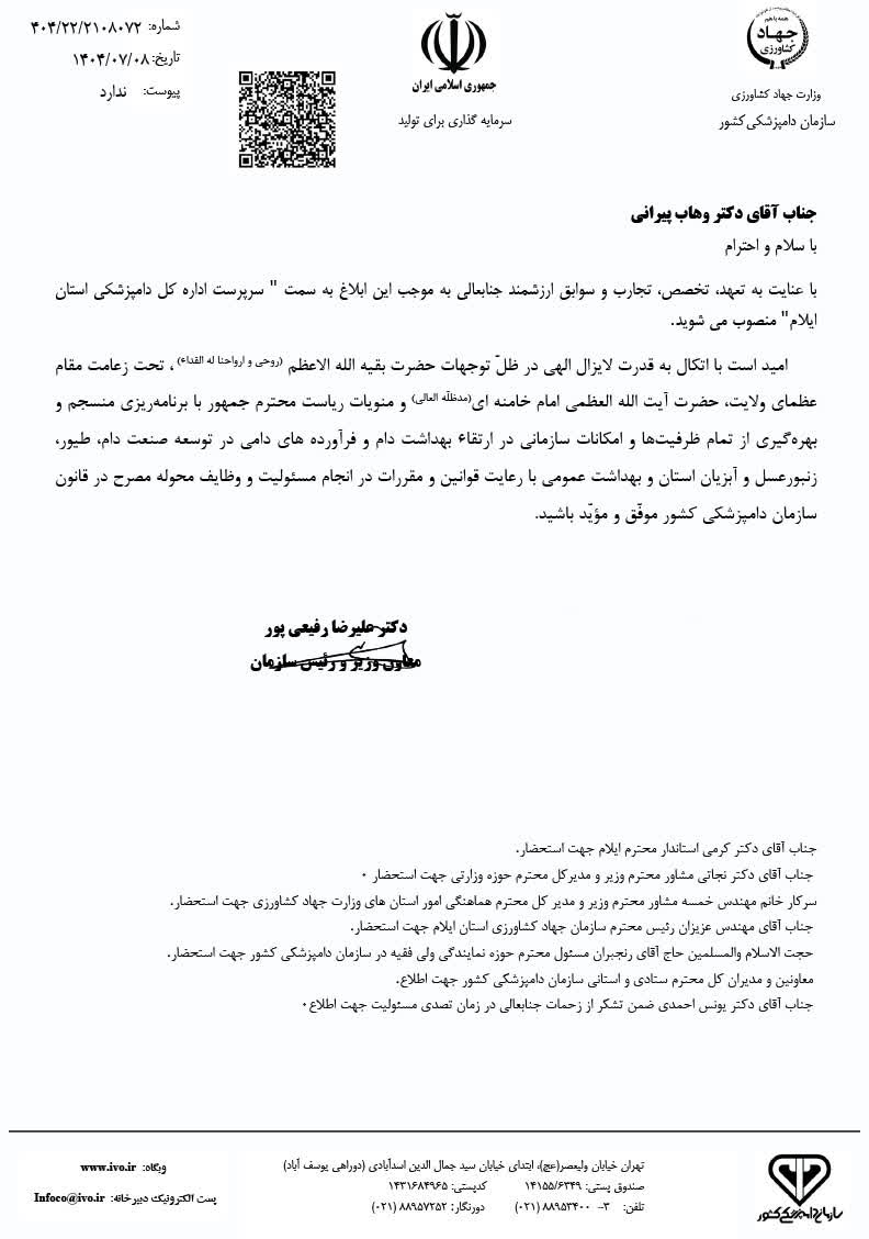 به گزارش فاخته، دکتر علیرضا رفیعی پور با صدور این ابلاغ، دکتر «وهاب پیرانی» به عنوان سرپرست جدید اداره کل دامپزشکی استان ایلام منصوب شد.