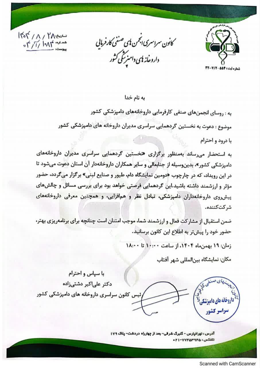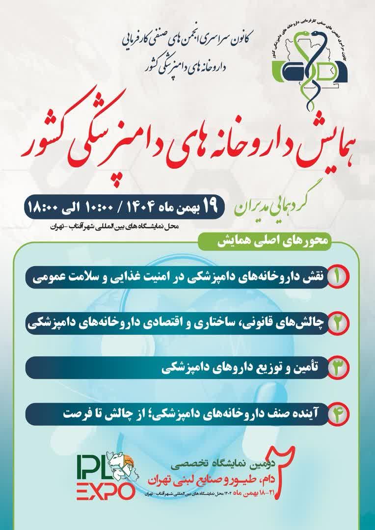 به استحضار می رساند به منظور برگزاری نخستین گردهمایی سراسری مدیران داروخانه های دامپزشکی کشور بدین وسیله از جنابعالی و سایر همکاران داروخانه دار آن استان دعوت می شود تا در این رویداد که در چارچوب دومین نمایشگاه دام طیور و صنایع لبنی برگزار میگردد حضور مؤثر و ارزشمند داشته باشید.