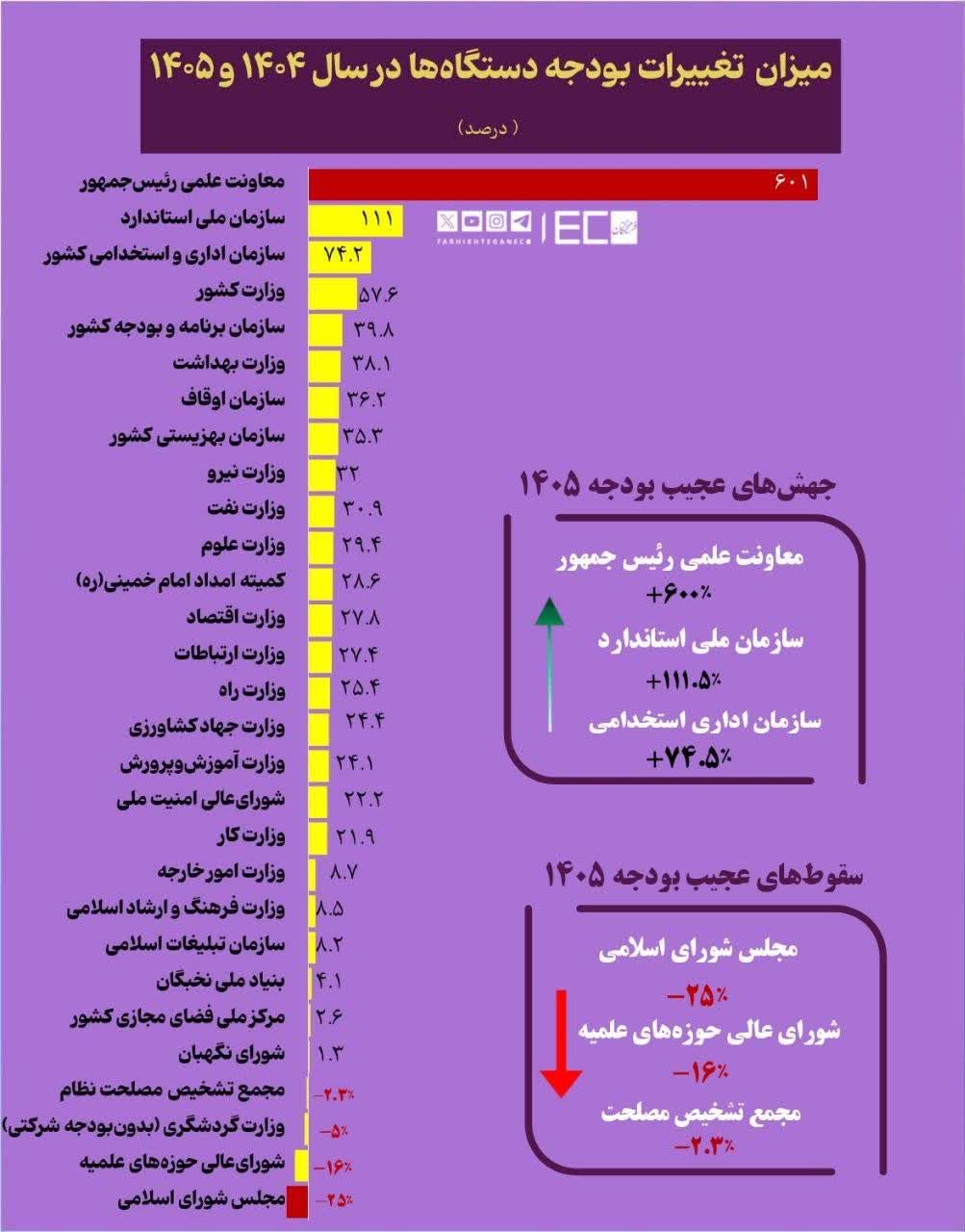 فرهیختگان با اعلام این آمار نوشت: بودجه سازمان اوقاف نیز با رشد ۳۶ درصدی به ۱.۵ همت رسیده؛ اما مجلس با ۲۵ درصد افت، رکورددار سقوط بودجهای است. پس از آن بودجه شورای عالی حوزههای علمیه ۱۶ درصد افت کردهاست.