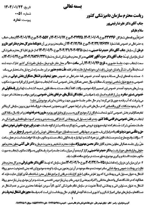 اما این دامپزشک عضو نظام دامپزشکی طی مکاتبه ای، عنوان داشت که مسایل وی درخواست های شخصی نبوده و ضمن قدردانی از این احساس مسئولیت سازمان دامپزشکی کشور، خواستار پاسخگویی به مسائل مطروحه در این مکاتبه شد.
