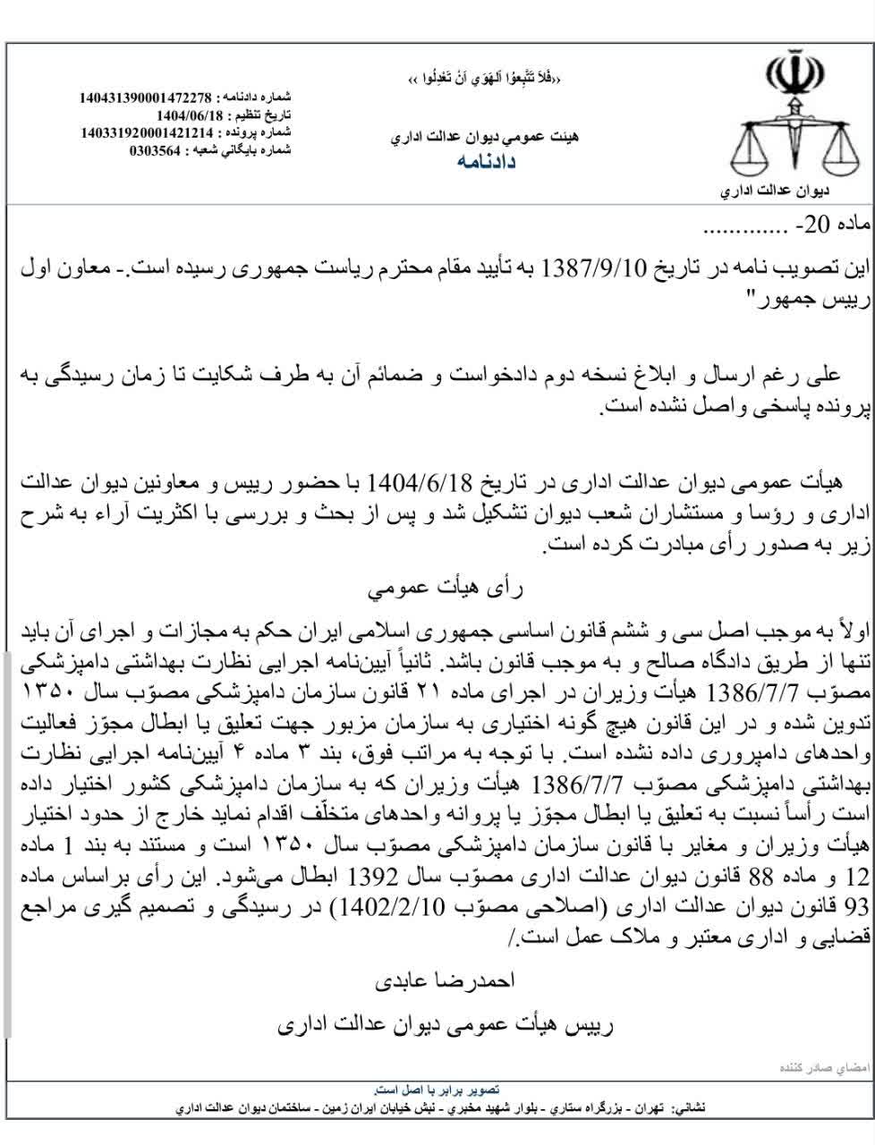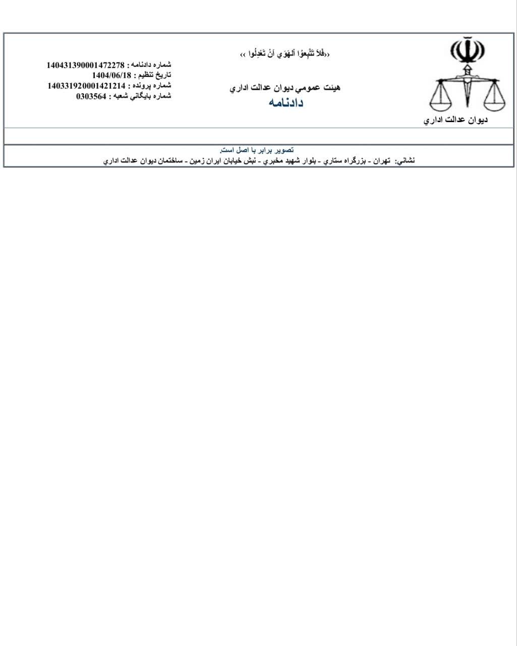 هیات عمومی دیوان عدالت اداری در تاریخ 1404٫6٫18 با حضور رییس و معاونین دیوان عدالت اداری و رؤسا و مستشاران شعب دیوان تشکیل شد و پس از بحث و بررسی با اکثریت آراء به شرح زیر به صدور رأی مبادرت کرده است.