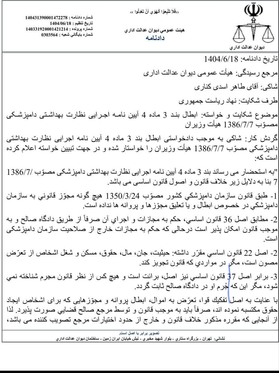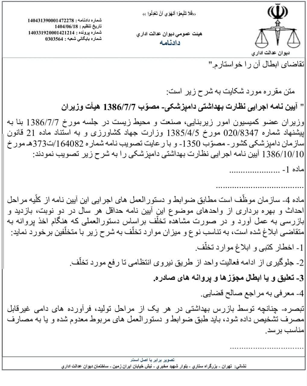 «در یک اقدام قانونی و در راستای صیانت از حقوق شهروندی و حمایت از تولیدکنندگان و فعالان حوزه دامپروری و کشاورزی، مدیر سازمان مردمنهاد دیدبان شفافیت عدالتخواه موفق شد با طرح شکایت در دیوان عدالت اداری، بخشی از آییننامه نظارت بهداشتی سازمان دامپزشکی کشور را که برخلاف قوانین و مقررات بود، از طریق هیأت عمومی دیوان عدالت اداری ابطال نماید.