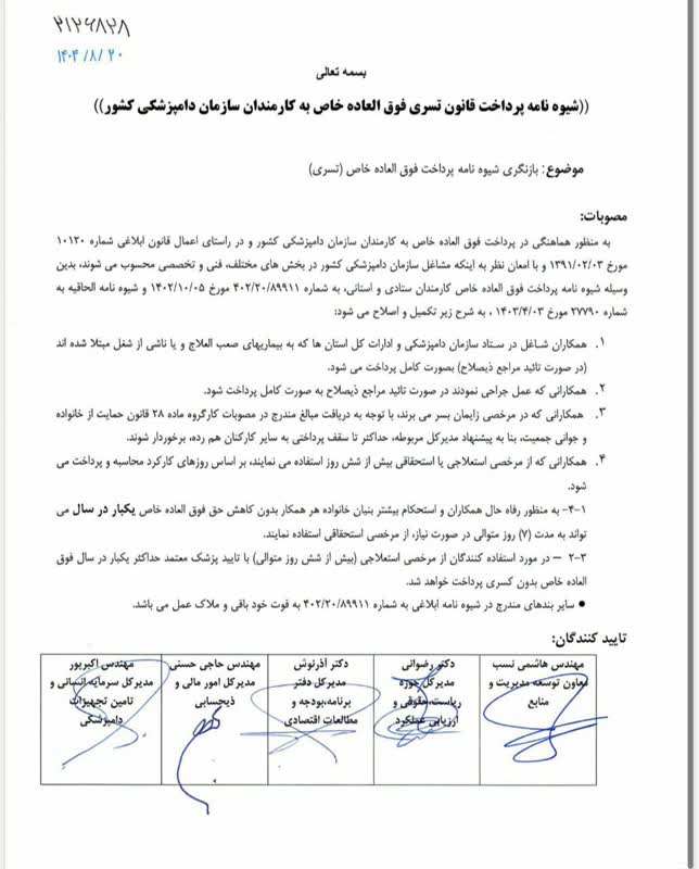 به گزارش فاخته، در شیوه نامه جدید پرداخت کامل تسری در صورت ابتلای همکاران به بیماری های خاص ، حوادث حین فعالیت اداری و عمل جراحی، و پرداخت کامل تسری برای مرخصی زایمان در نظر گرفته شده است.