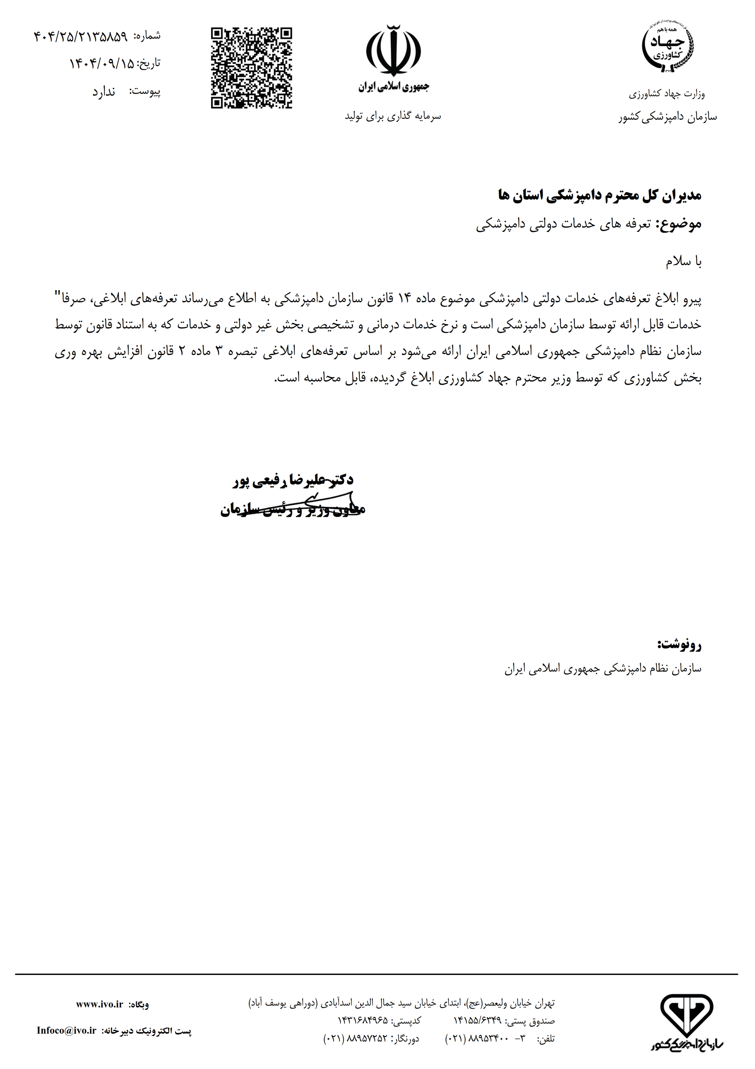 به گزارش فاخته، رئیس سازمان دامپزشکی کشور، طی نامهای رسمی خطاب به مدیران کل دامپزشکی استانها، عنوان کرد که تعرفههای ابلاغی اخیر، منحصراً ناظر بر خدمات دولتی قابل ارائه توسط سازمان دامپزشکی کشور بوده و ارائه خدمات تشخیصی، درمانی و حرفهای در بخش غیردولتی، مطابق قانون، در حیطه اختیارات سازمان نظام دامپزشکی قرار دارد.