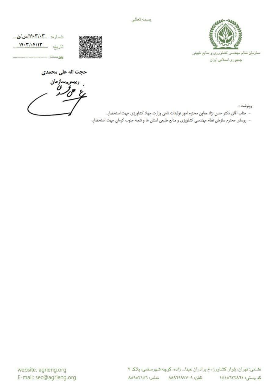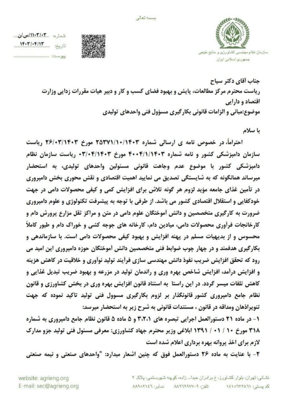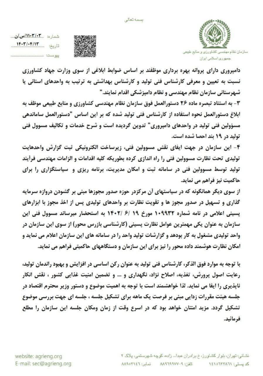 به گزارش فاخته در نامه رئیس سازمان نظام مهندسی کشاورزی و منابع طبیعی با اشاره به مستندات قانونی و الزامات بکارگیری مهندسین علوم دامی در مراکز تولیدی مرتبط آمده است: