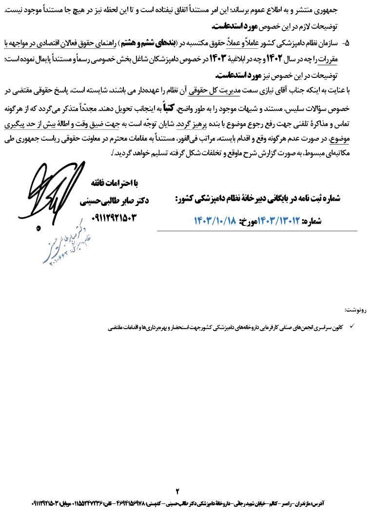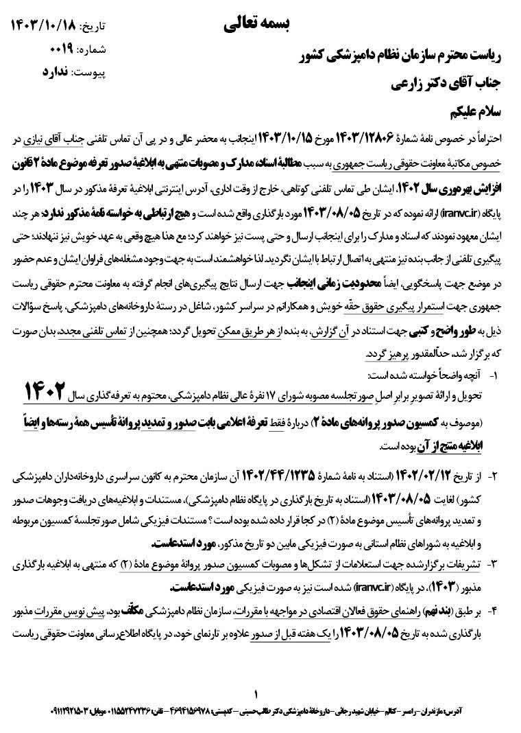 به گزارش فاخته، دکتر طالبی حسینی، که مجدانه به دنبال پیگیری درخواست خود می باشد این بار طی نامه ای خطاب به رئیس سازمان نظام دامپزشکی خواستار آن شده تا تحویل و ارائۀ تصویرِ برابرِ اصلِ صورتجلسه مصوبه شورای 17نفرۀ عالی نظام دامپزشکی، محتوم به تعرفه گذاری سال 1402 انجام شود.