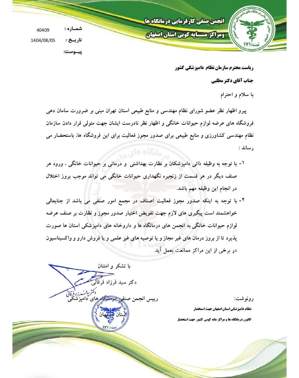 به گزارش فاخته، در نامه دکتر سیدفرزاد فرقانی، خطاب به رئیس سازمان نظام دامپزشکی آمده است: