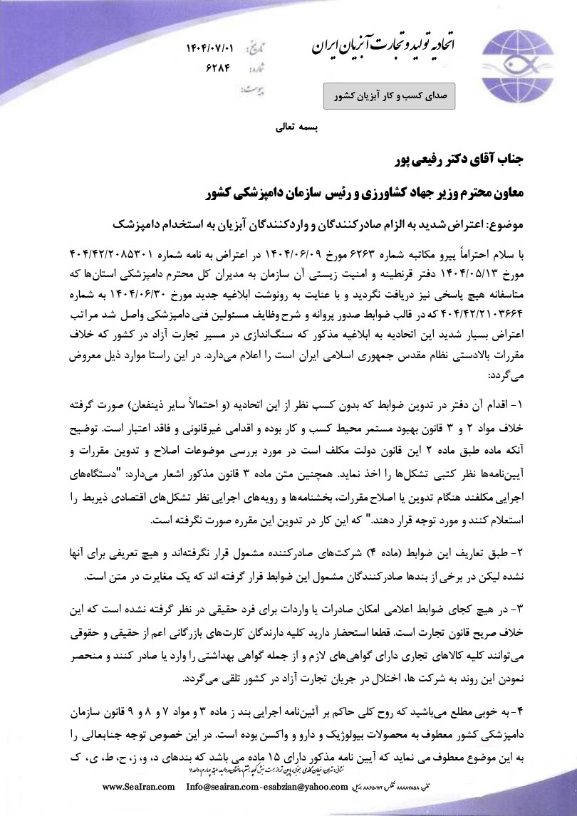 با سلام، احتراماً پیرو مکاتبه شماره ۶۲۶۳ مورخ ۱۴۰۴/۰۶/۰۹ در اعتراض به نامه شماره ۴۰۴/۴۲/۲۰۸۵۳۰۱ مورخ ۱۴۰۴/۰۵/۱۳ دفتر قرنطینه و امنیت زیستی آن سازمان به مدیران کل محترم دامپزشکی استانها که متاسفانه هیچ پاسخی نیز دریافت نگردید و با عنایت به رونوشت ابلاغیه جدید مورخ ۱۴۰۴/۰۶/۳۰ به شماره ۴۰۴/۴۲/۲۱۰۳۶۶۴ که در قالب ضوابط صدور پروانه و شرح وظایف مسئولین فنی دامپزشکی واصل شد، مراتب اعتراض بسیار شدید این اتحادیه به ابلاغیه مذکور که سنگاندازی در مسیر تجارت آزاد در کشور که خلاف مقررات بالادستی نظام مقدس جمهوری اسلامی ایران است را اعلام میدارد. در این راستا موارد ذیل معروض می گردد: