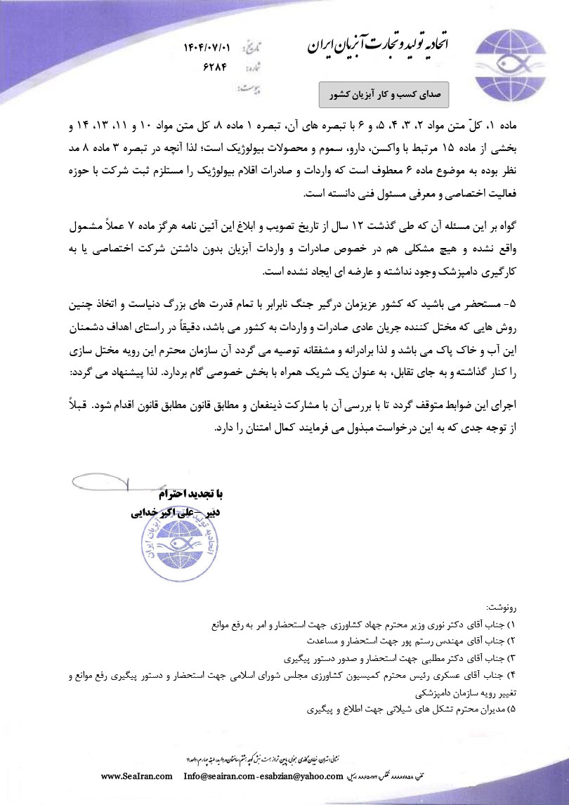 گواه بر این مسئله آن که طی گذشت ۱۲ سال از تاریخ تصویب و ابلاغ این آئیننامه هرگز ماده ۷ عملاً مشمول واقع نشده و هیچ مشکلی هم در خصوص صادرات و واردات آبزیان بدون داشتن شرکت اختصاصی یا به کارگیری دامپزشک وجود نداشته و عارضهای ایجاد نشده است.