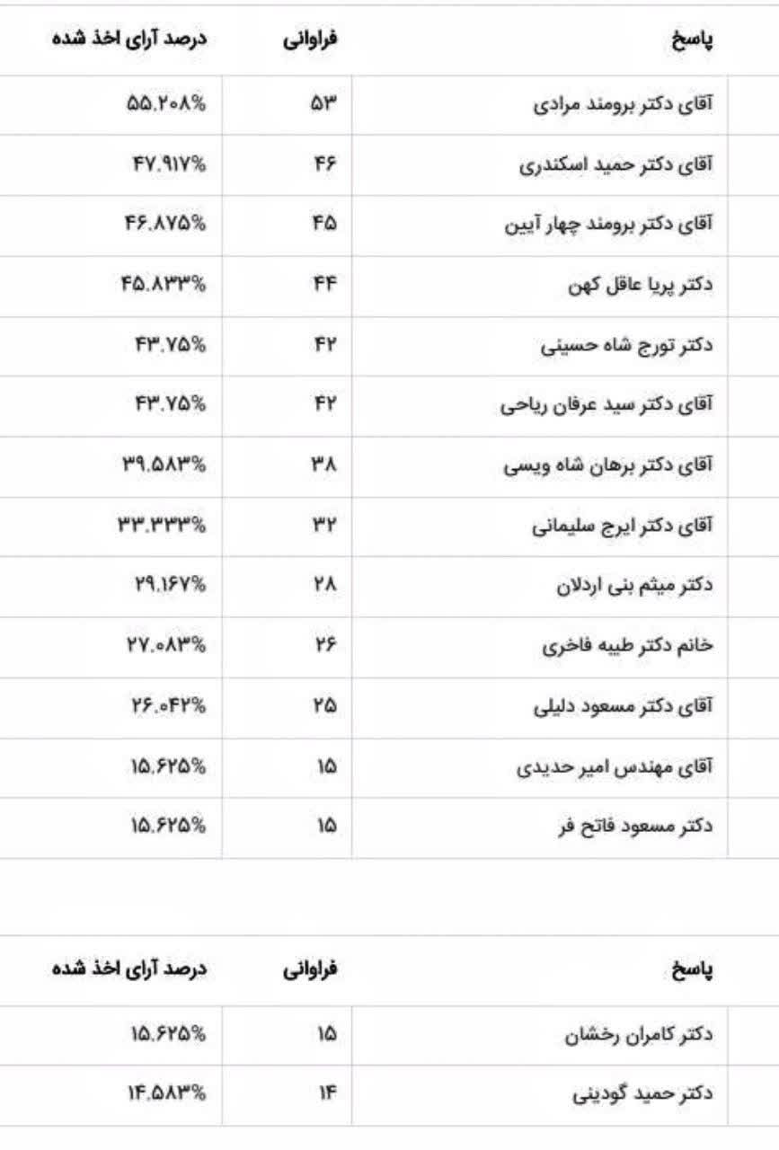 به گزارش فاخته، در این دوره از انتخابات 104 نفر حق رای داشتند که پس از برگزاری حضور 94 واجدین شرایط محرز شد و افراد به شرح زیر انتخاب شدند.