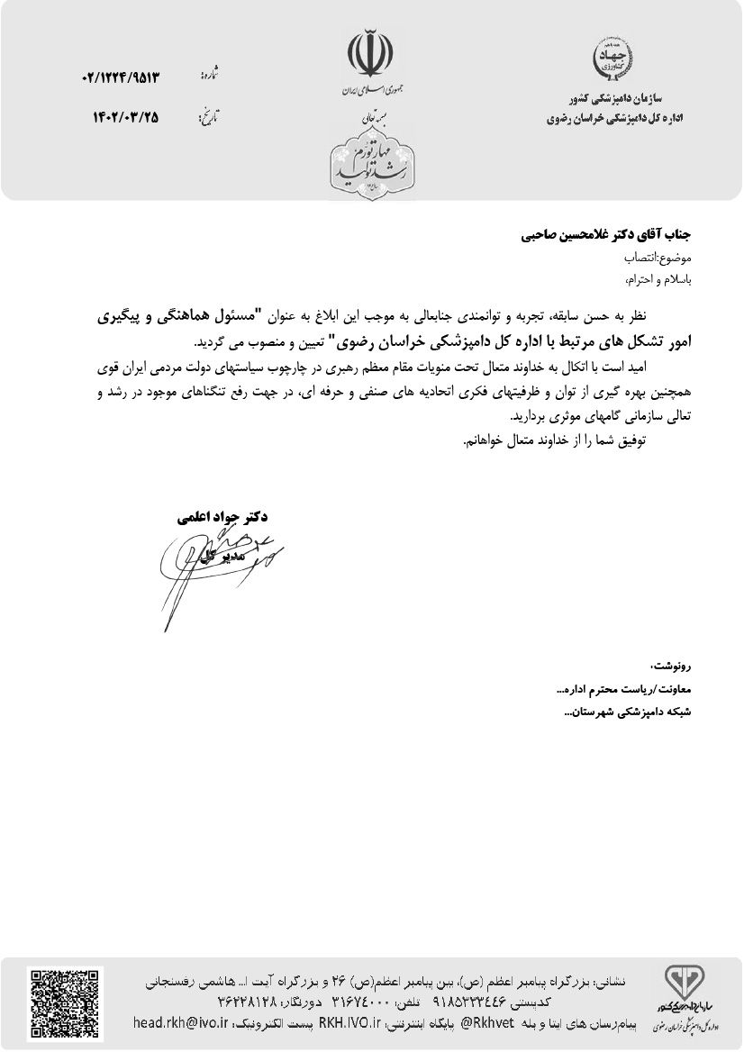 به گزارش فاخته، در حکم صادره از سوی دکتر جواد اعلمی آمده است: