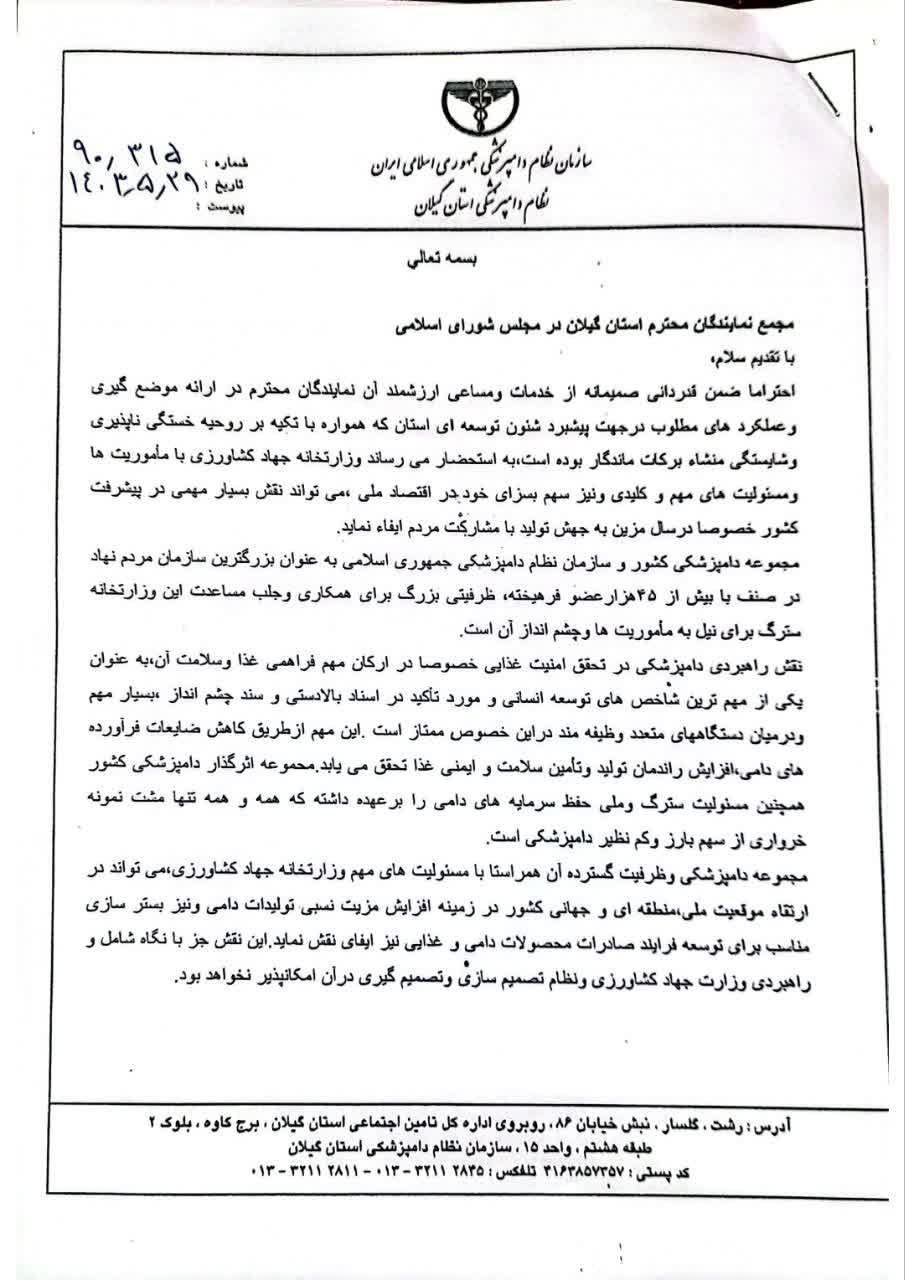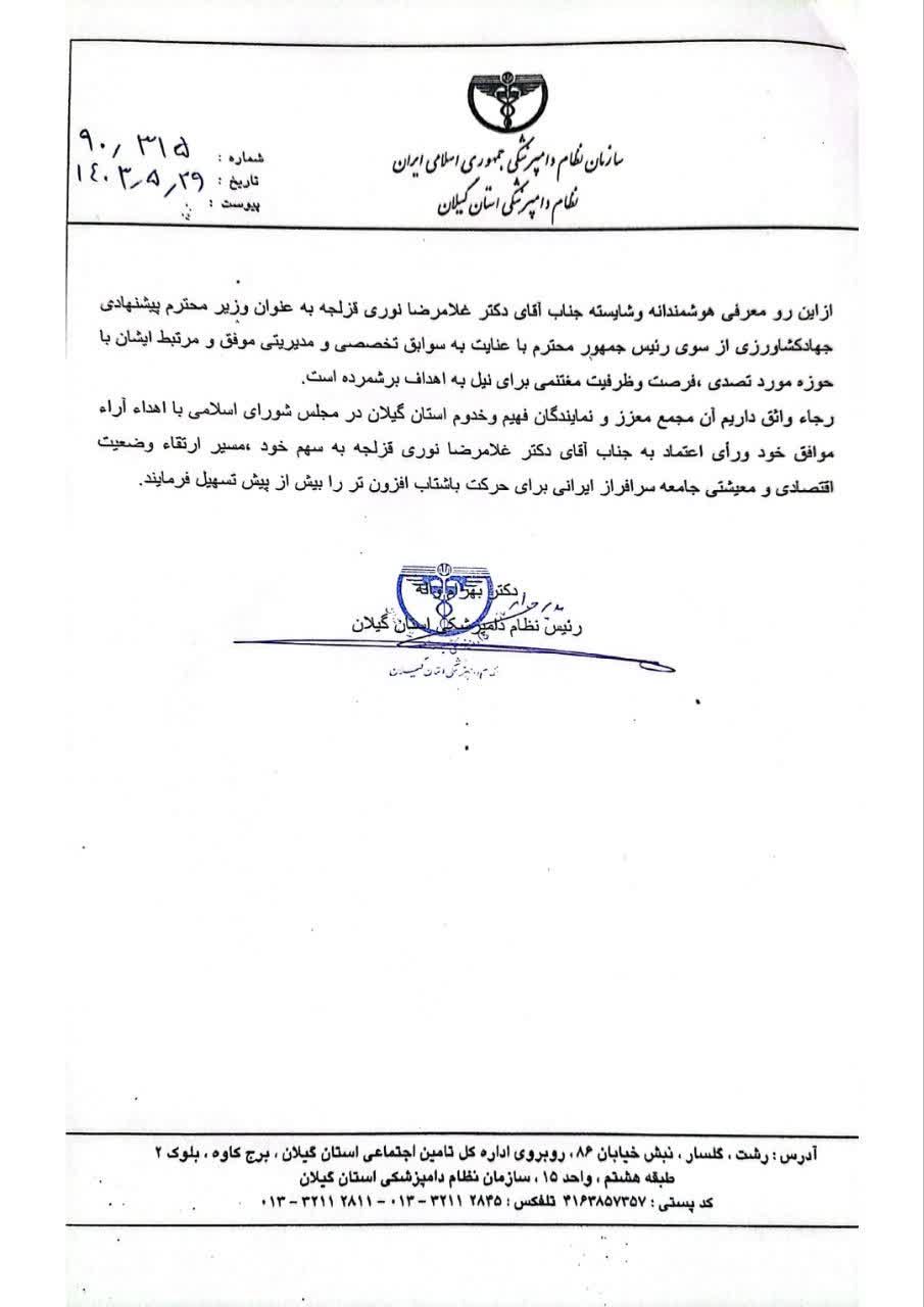 رئیس شورای نظام دامپزشکی استان گیلان با ارسال نامه ای خطاب به مجمع نمایندگان گیلان، خواستار حمایت ایشان از «نوری قزلجه»؛ وزیر پیشنهادی جهاد کشاورزی شد.
